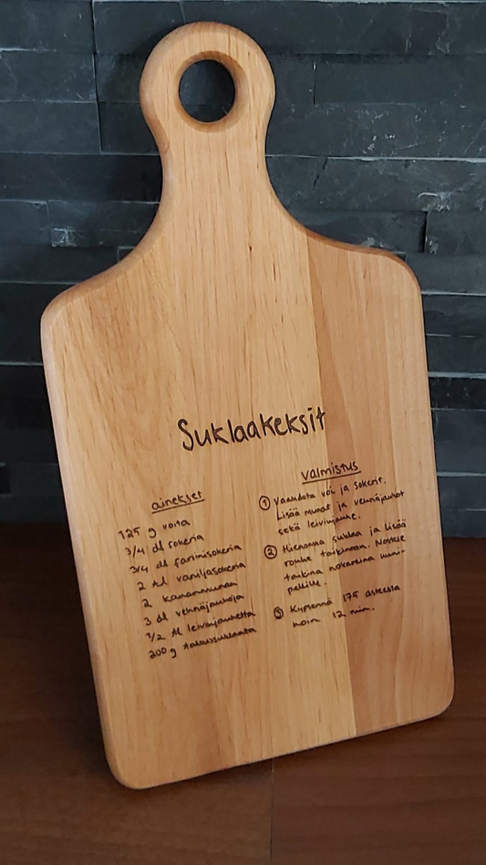 Voit tilata meiltä myös personoituja kaiverruksia, kuten vaneriin kaiverrettuja kuvia omista valokuvistasi, oman lempikaupunkisi kaiverrettuna eri pinnoille, leikkuulaudan omalla reseptillä ja paljon muuta.